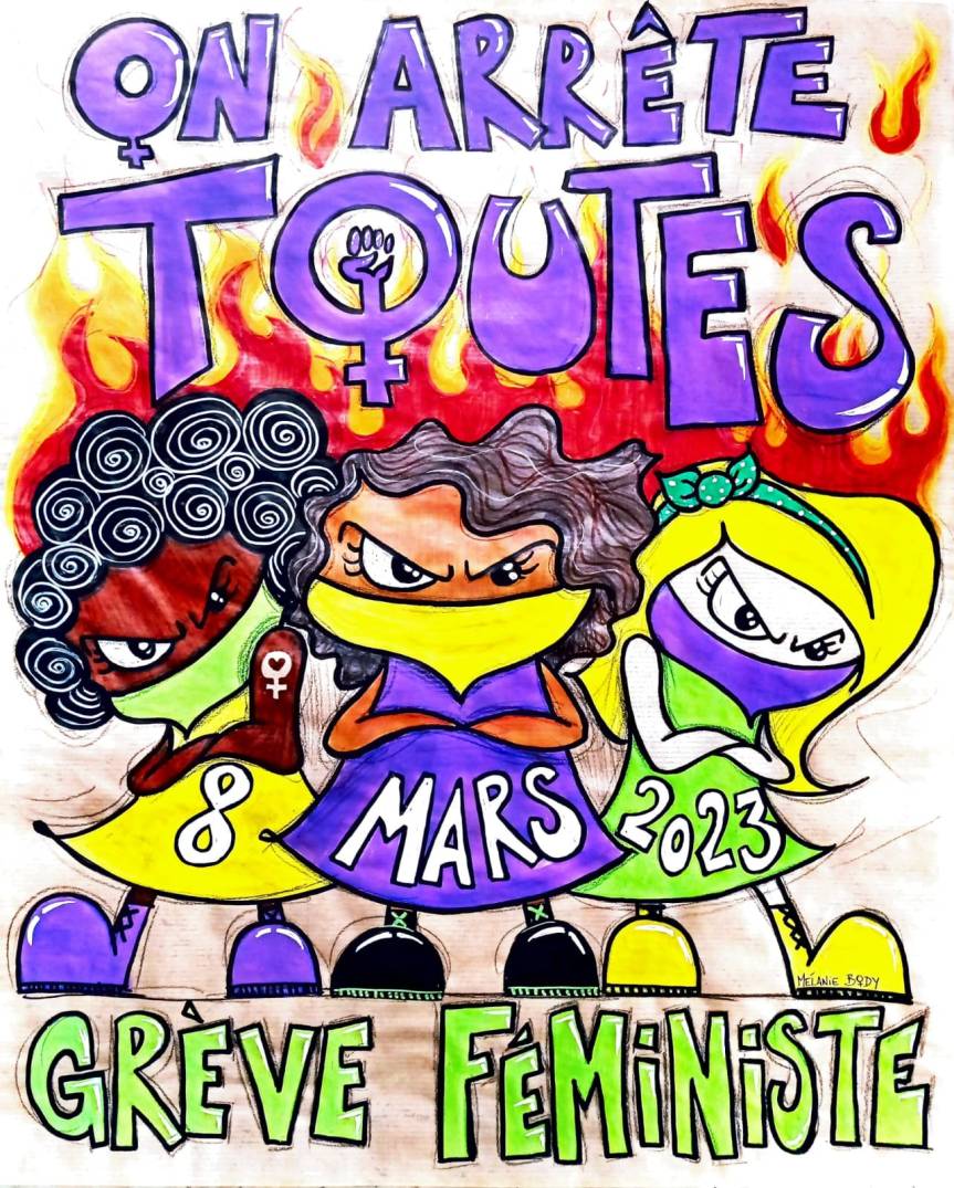 On montre la solidarité et la force des femmes. Le 8 mars, on grève, on débraye, on agit. Faisons du bruit à 15h40, heure à laquelle chaque jour les femmes arrêtent d’être payées. Le 8 mars, toustes ensemble, on envahit les rues contre la réforme des retraites, pour l’augmentation des salaires, contre les violences sexistes et sexuelles et en solidarité internationale avec les femmes du monde entier. Ras le bol du patriarcat !