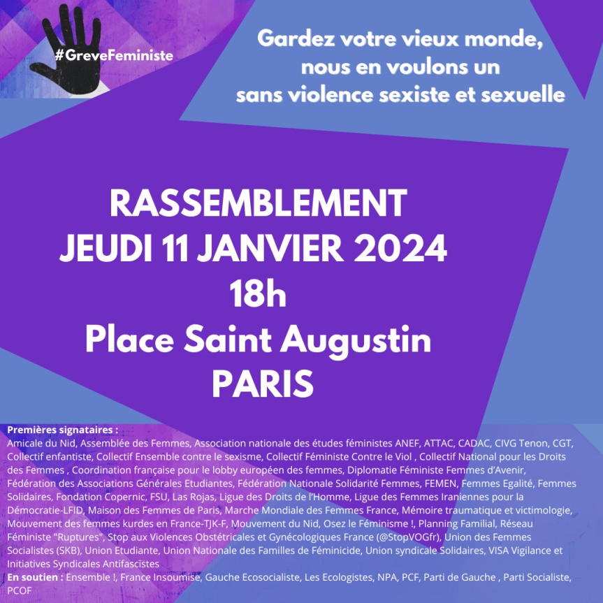 Nous appelons toutes celles et ceux qui défendent les droits des femmes, des enfants et des minorités de genres, et qui refusent les violences sexistes et sexuelles à des rassemblements devant toutes les préfectures ou les palais de Justice de France le Jeudi 11 janvier 2024.