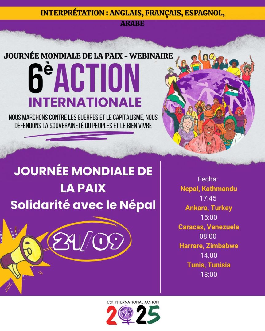 Nous marchons contre les guerres et le capitalisme, nous défendons la souveraineté des peuples et le bien vivre. Rejoignez-nous pour le webinaire de la Journée mondiale de la paix de la 6e Action internationale !